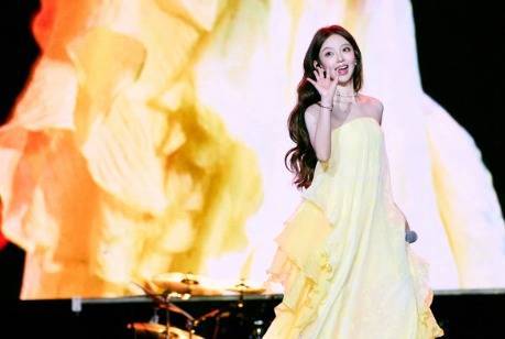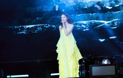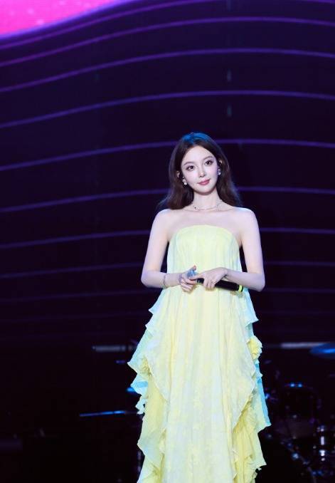 汪小敏的演唱会舞台妆造,淡黄的长裙,蓬松的头发!